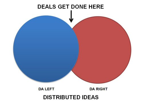 Anybody’d think them bums in the White House, the Senate, and the House of Reps could work this thing out. But Orszag shows two simple charts that explain why it’s so hard to fix. The first one explains the way Left and Right thinking used to overlap. All the deals get done in that overlap area. (This guy’s an economist and uses bell curves to make his point. Ethan tells me Venn diagrams might make more sense to most people, so I’m giving you that version.) Here’s the way it looked in the ‘60s: