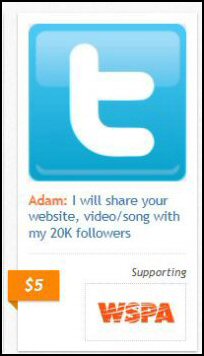 Here’s a real example:  Look at dis screenshot detail. Adam is willin’ to blast yer weblink to his 20,000 Twitter followers fer five lousy bucks.  The money goes to da WSPA t’ help dem furry creatures.  John’s gonna foam at the mouth when he sees dis ’cause he’s tryin’ t’ promote his new novel ‘n’ dis is the way to do it.