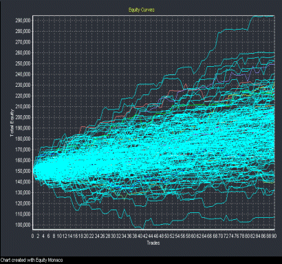 But we can make use of a simple technique to forecast the future. It’s relatively obscure but don’t let that throw you. This is a really simple way to estimate the range of possible outcomes. It’s called a Monte Carlo simulation. You feed-in a series of winners and losers and let the computer string them together with replacement many, many times. Say 100,000 times. It might look like the chart below:
